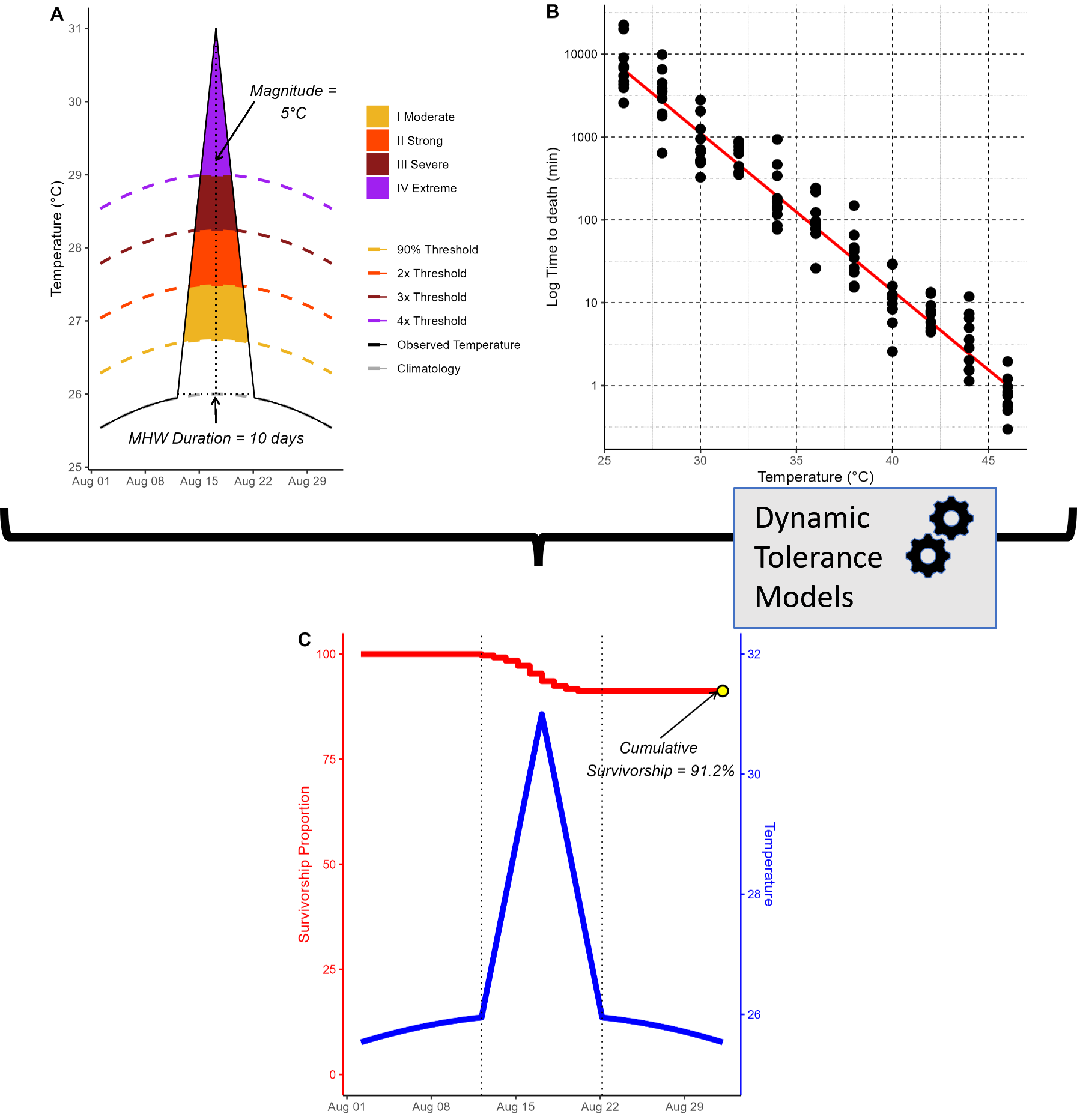 There are a few different ways we could have gone around this. We could have taken an empirical approach, wherein I either observe organism responses in the field to different types of heatwave (data availability issues, not easily comparable between events) or I simulate heatwaves in the lab and observe responses (more controlled, but I could only replicate a dozen or so realistic heatwaves). We decided that, given the wide-open nature of the question to conduct an in silica simulation to generate a continuous response surface across many (527!) heatwaves varying in magnitude and duration. As our response, we selected survival resulting from thermal death time models (Rezende et al. (2020), Jørgensen et al. (2021)).